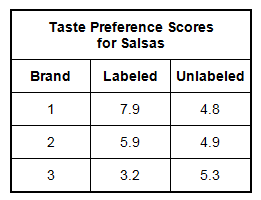 Three hundred twenty-six consumers were asked to rate three salsas on a scale of 1 to 10 with 10 representing the best taste. First they were asked to rate the salsas with all brands clearly labeled. On a different occasion, the same group of consumers was asked to rate the same salsas with the labels removed. The results from each test were averaged as shown in the table below.